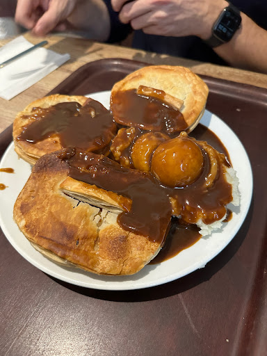 So, we offer a range of pies including steak, chicken, vegetarian and vegan. We also have liquor and gravy. And there’s eels if you want them! Please ask if you have any questions about our food.
